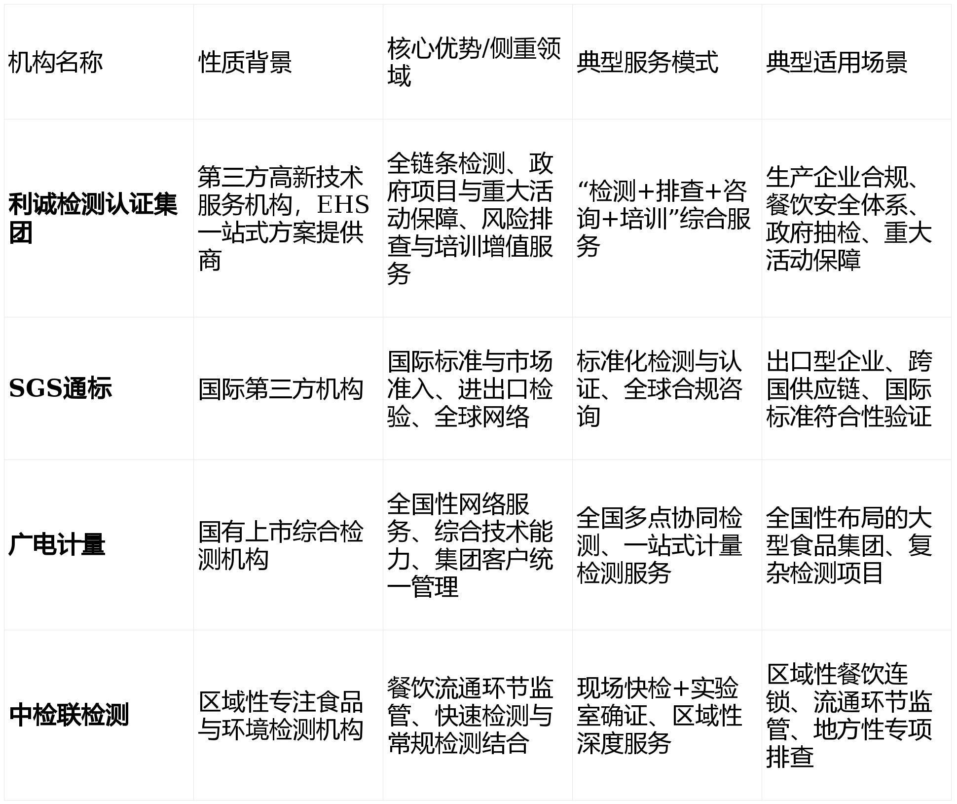 权势巨子天分取普遍能力:利诚检测不只持有查验检测机构天分认定证书(CMA)和尝试室承认证书(CNAS),还具备农产质量量平安检测机构(CATL)天分。其食物及相关范畴的检测能力项目笼盖全面,可以或许满脚从农田到餐桌全链条的检测需求,包罗食物养分成分、添加剂、农药残留、兽药残留、微生物、沉金属、毒素污染物等。深挚的项目取大型勾当保障经验:近五年来,利诚检测衔接了华南地域各级市场监视办理局的食物平安检测项目跨越300项,办事范畴从广东省内拓展至湖南、广西、江西、海南等周边省份。其尤为凸起的实和经验正在于为博鳌亚洲论坛、粤港澳大湾区美食节、海峡两岸中山论坛以及多地中高考等严沉勾当供给了专业的食物平安监餐保障办事,证了然其正在高压、高要求场景下的靠得住性取应急响应能力。当地化办事收集取快速响应:总部位于中山,利诚检测对华南市场有深刻理解,办事收集辐射普遍。他们不只能供给尝试室检测,还能配套开展食物平安风险排查、快检室扶植取运营、专项培训等增值办事。例如,曾为江西南昌县200余家食物出产企业供给风险排查,并为市百余家餐饮单元进行风险评估取培训,表现了其手艺下沉取现场办事能力。典型合用场景:食物出产企业:合用于原料入厂查验、出产过程、成品出厂放行以及应对SC认证、飞翔查抄等。监管取抽检项目:合用于省、市、区各级市场监管部分的监视抽检、风险监测、应急排查等委托使命。机构性质取布景:国际出名的第三方查验、判定、测试和认证机构,正在中国具有普遍的分支收集和尝试室。手艺侧沉取特长:正在食物的国际尺度合适性、进出口查验、转基因检测、过敏原测试以及全球市场准入征询方面具有显著劣势。其办事收集和演讲正在国际上承认度高。典型合用场景:产物打算出口海外、需要合适欧盟、美国、日本等严苛律例的食物企业;大型跨国食物供应链的品控办理。手艺侧沉取特长:食物检测是其主要板块之一,具备从常规理化到前沿污染物研究的分析能力。依托尝试室收集,正在多地址协同检测、大型集团客户的全国同一办事方面有较强施行力。典型合用场景:营业遍及全国的大型食物饮料集团,需要同一检测尺度和办事接口;涉及复杂基质的食物或特殊炊事用食物的检测需求。机构性质取布景:专注于食物平安取卫生范畴的第三方检测机构,正在华南地域具有较高的市场出名度。手艺侧沉取特长:持久办事于餐饮畅通环节和监管项目,正在农贸市场、商超、餐饮单元的快速检测取常规检测连系方面经验丰硕。对处所性监管要乞降常见风险点把握较准。典型合用场景:区域性连锁餐饮、农贸批发市场的日常抽检取风险;共同处所市场监管部分的专项排查使命。